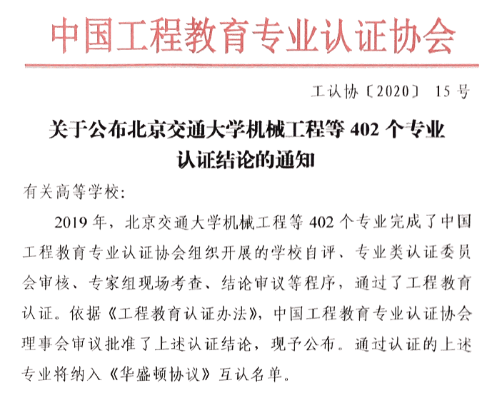 据悉,中国工程教育专业认证协会成立于2015年4月,是由工程教育相关的机构和个人组成的全国性社会团体,通过开展工程教育专业认证,提高我国工程教育质量,为工程教育改革和发展服务,为工程教育适应政府、行业和社会需求服务,为提升中国工程教育国际竞争力服务。协会建立了国际实质等效的工程教育认证体系,认证工作得到了国际同行的广泛认可。2016年6月,我国正式加入国际上最具影响力之一的工程教育学位互认协议之一《华盛顿协议》,通过认证协会认证的工科专业,毕业生学位可以得到《华盛顿协议》其他组织的认可。