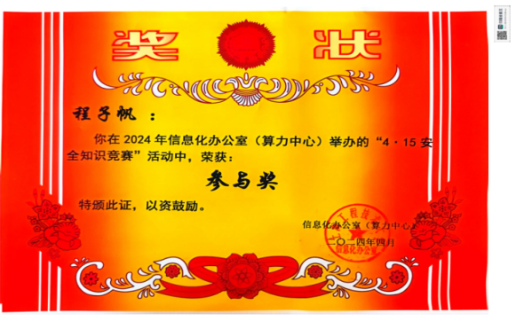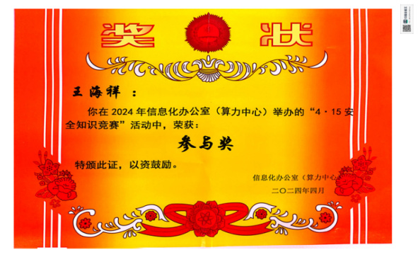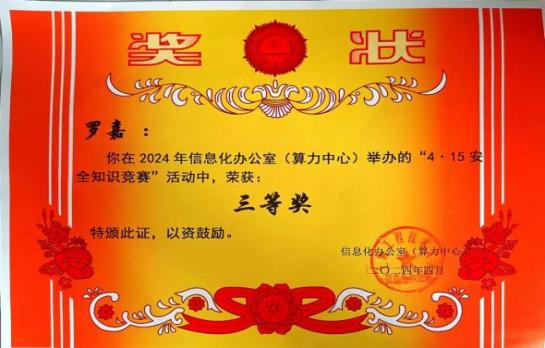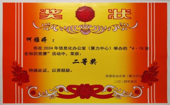 参与国家安全知识竞答能有效增强员工的国家安全意识。公司积极动员员工参加由信息化办公室(算力中心)、党委保卫部()(综治办、安全办)、资产与实验室管理处(招投标中心、大型仪器设备管理中心)联合开展的“4·15全民国家安全教育日”师生在线知识竞赛,取得了良好成效,全校16名获奖员工中公司员工5名,其中何雅婷荣获二等奖、罗嘉荣获三等奖。