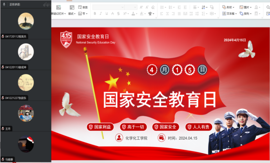 公司研究生、本科生党支部以国家安全教育为主题,利用“三会一课”,深入学习宣传国家安全教育相关知识。高分子材料与工程专业员工党支部书记王新燕老师通过党课为党员同学解读了国家安全教育日设立的概况、国家安全基本知识、相关法律法规摘录等内容;化学工程与工艺员工党支部王小萌老师组织支部党员、积极分子一起观看了保密公益宣传片《藏在照片里的秘密》,共同学习了《总体国家安全观学习纲要》,并进行了深入讨论交流。