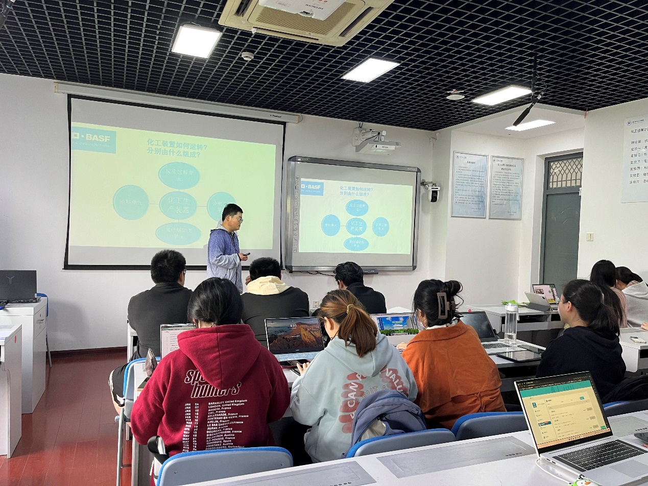 为了促进产教融合,拓宽员工的视野,更好地培养员工理论联系实际,提高解决复杂工程实际问题的综合能力,同时在化工相关学科竞赛取得优秀的成绩,4月19日上午巴斯夫(中国)有限公司郭冲工程师应邀来到《化工过程与工艺课程设计》的课堂,为化学工程与工艺专业的员工带来了一堂别开生面的专业课。