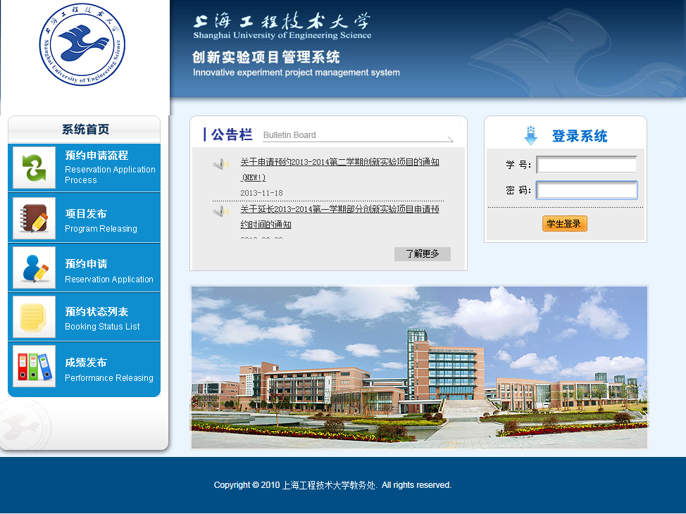 1、用IE浏览器打开创新实验项目管理系统(http://cxsyyy.sues.edu.cn),输入学号和密码登陆系统。