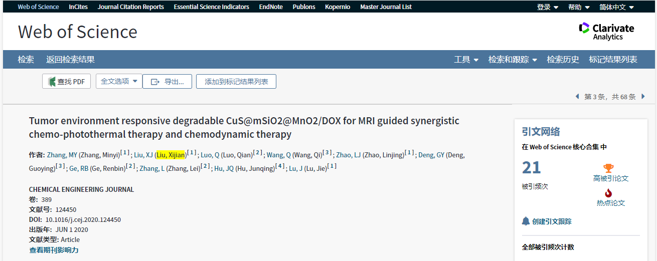 近日,公司44118太阳成城集团药物分析与高效化研究团队的刘锡建副教授、陆杰教授指导研究生在化学工程领域著名学术期刊《Chemical Engineering Journal》发表的学术论文“Tumor environment responsive degradable CuS@mSiO2@MnO2/DOX for MRI guided synergistic chemo-photothermal therapy and chemodynamic therapy”,同时入选新一期的ESI高被引和热点论文,期刊最新影响因子为10.65。论文的被引用次数为其工程领域最优秀的前0.1%,说明该科研成果得到同行认可。