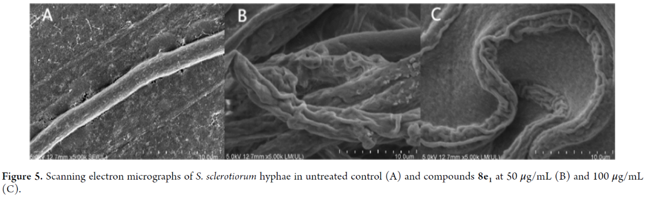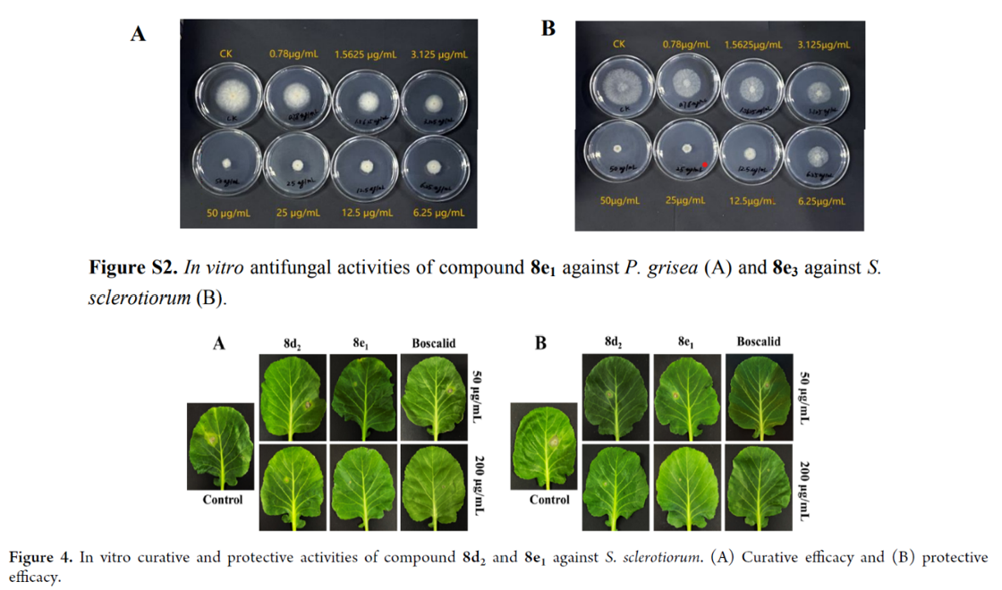 此外,李洪森老师还指导研究生刘缘在一区TOP期刊 《Pest Management Science》(2023, 79: 1273–1283, 影响因子3.8)发表题为 “Design, synthesis, and antifungal activities of novel sulfoximine derivatives for plant protection” 的研究成果,创新性设计、合成了一系列新的亚砜亚胺类化合物,发现了对核盘菌、稻瘟菌具有优良抑制活性的先导化合物。