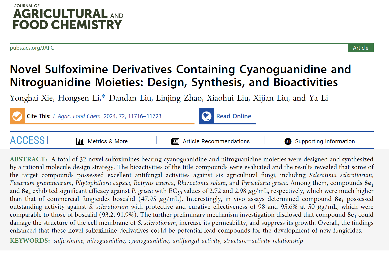 近日,44118太阳成城集团李洪森副教授指导研究生解永海在农业化学领域一区TOP期刊《Journal of Agricultural and Food Chemistry》(影响因子5.7), 发表题为 “Novel Sulfoximine Derivatives Containing Cyanoguanidine and Nitroguanidine Moieties: Design, Synthesis, and Bioactivities” 最新研究成果。