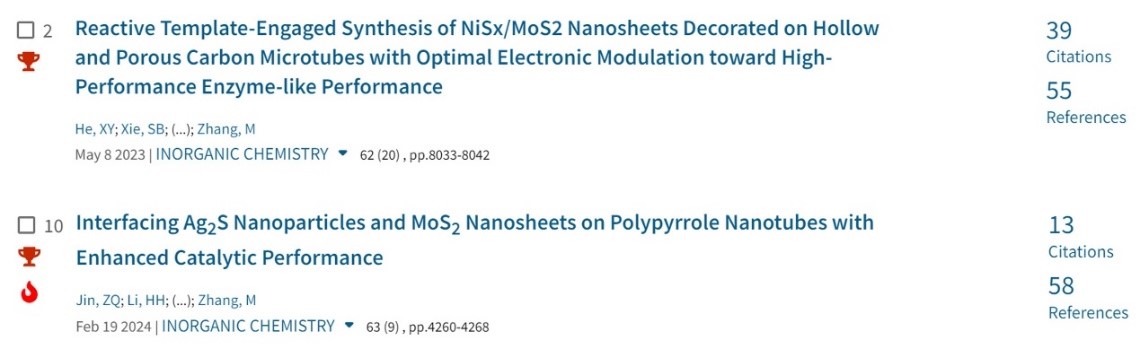 为了提高二硫化钼纳米尺度材料催化活性,通过结构设计、分子组装与表面改性构建了结构性能可调的负载二硫化钼纳米片的氮掺杂一维纳米管(Chinese Chemical Letters 2020, 31, 1109,一区),同时,创新性提出了分散二硫化钼在聚吡咯空管上的新方法(Journal of Materials Chemistry B 2020, 8, 7801,三区),被该期刊评选为“Editor’s Choice”。将过渡金属离子铁掺杂的二硫化钼纳米片与一维导电聚合物相结合,有效提升了二硫化钼的类酶催化性能(Dalton Transactions 2021, 50, 15380 三区;Colloids and Surfaces A: Physicochemical and Engineering Aspects, 2020, 605, 125347和2022, 655, 130225,二区;Inorganic Chemistry 2022, 61, 542和2024, 63,18263,二区; Dalton Transactions 2022, 51, 15403,三区)。