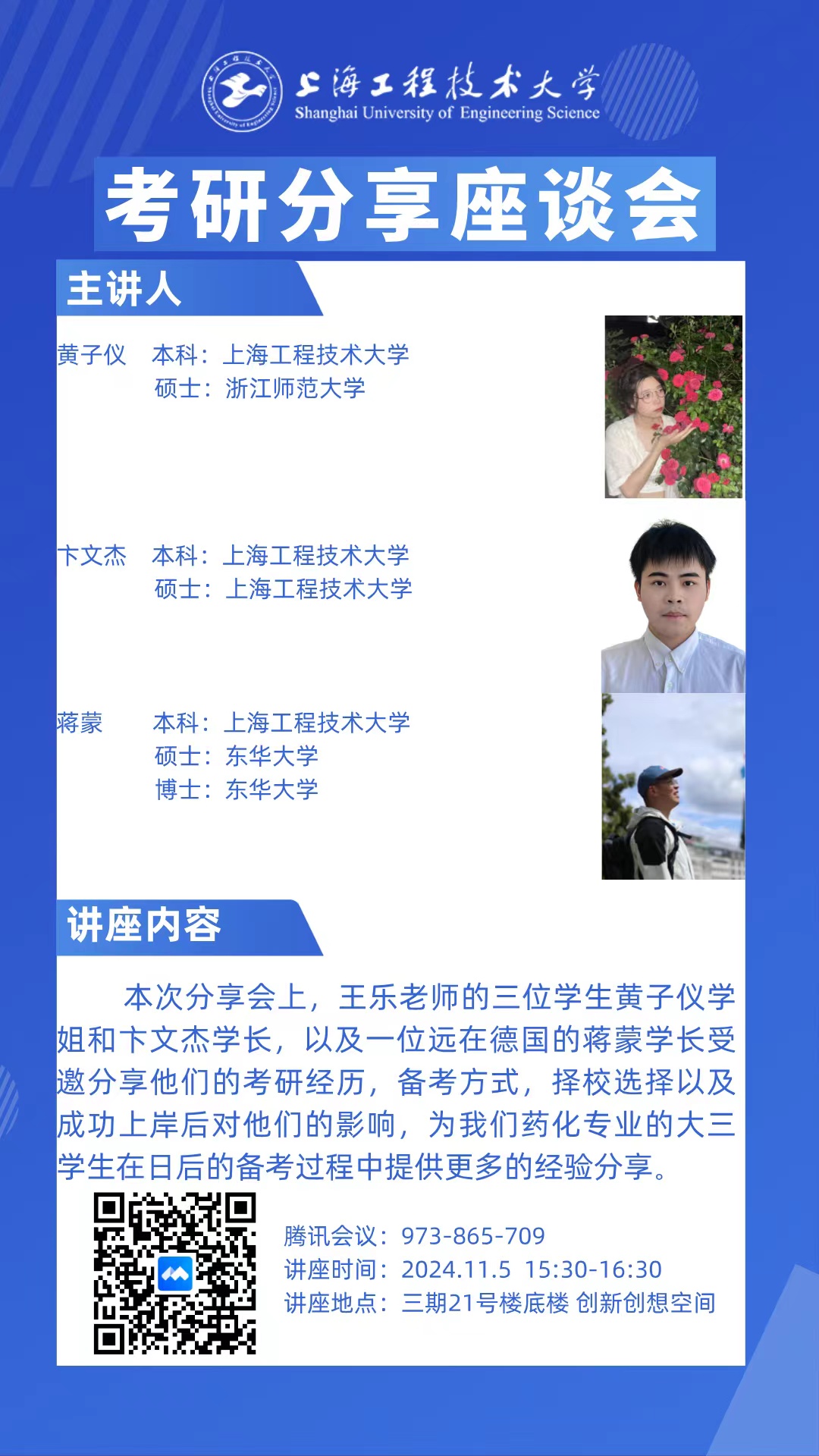 近日,44118太阳成城集团举行了一场旨在帮助药物化学专业大三员工理清考研思路、明确考研方向的座谈会。此次座谈会由2022级药物化学专业班主任王乐老师主持,班长顾文毅协助,邀请了三位优秀的学长学姐,他们分别是黄子仪(线上)、蒋蒙(线上)以及卞文杰。三位学长学姐围绕择校、备考思路、复习安排以及个人建议四个方面,为在场的学弟学妹们提供了宝贵的经验。