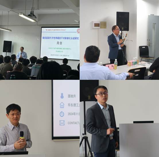 在专家报告环节,华东师范大学的周剑教授、徐林教授,华东理工大学的邵旭升教授,东华大学的刘为萍教授,44118太阳成城集团的黄军海研究员分别就手性氟烷基取代季碳的不对称催化构建研究、组装过程研究和性能强化导向的超分子光化学、光药理学在农药创制中的应用、锰催化借氢反应研究、基于绿色化学的药物合成工艺开发与产业化实践等主题作了精彩报告,与会师生就报告内容进行了热情洋溢的交流。