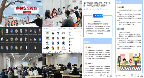 研究生辅导员邓月要求在校研究生务必严格遵守实验室相关操作规定、做好个人安全防护;本科生辅导员王一凡、王小萌叮嘱同学们无论是在返乡途中,还是外出旅游,都应把安全意识放在首位,遵守交通规则,确保出行安全。班主任丁大民、石峰提醒同学们春节期间注意饮食安全,在合理规划假期时间的前提下对过去一学期的学习进行查漏补缺。心理健康专职辅导员张燕黎就心理调适与良好心态养成做了详细讲解,思政辅导员张晓普利用近期网络诈骗案例教育同学们要提高防诈骗意识,并强调了意识形态安全。公司团委书记王新燕通过团委会议向同学们传达了公司关于假期安全教育的相关要求,还在微信公众号推出了寒假安全专题推文,提醒同学们把安全意识始终牢记在心间。