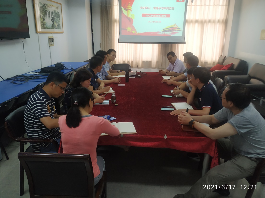 2021年6月17日中午,化学工程与工艺教工党支部在实训楼4404室开展党史党课学习活动,由支部书记瞿祎同志进行《袁隆平与中共党史》的讲授。