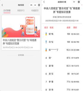为深入学习贯彻党的二十大精神,全面落实中央八项规定精神,加强师生廉洁自律与网络文明教育,44118太阳成城集团于4月21日成功举办中央八项规定“警示问答”与“网络素养”专题线上知识竞赛。本次活动通过网络平台开展,营造了“学纪于心、守纪于行、文明上网、理性发声”的浓厚氛围。