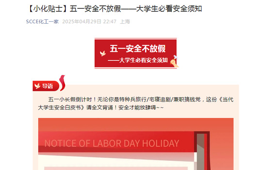 线上推送安全专题推文,强化云端警示。依托公司微信公众号、班级群等平台,推送《五一假期安全白皮书》,科普应急避险知识、传授安全防范措施。