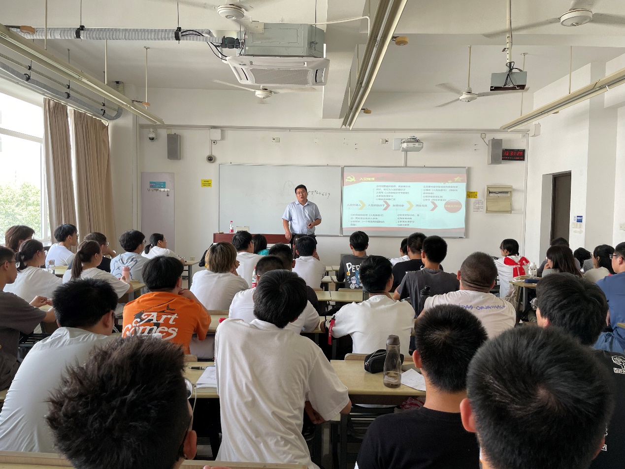 随后,王金果老师从入党的必要条件、发展党员的程序和标准以及如何积极靠近党组织等方面向新生介绍加入党组织的流程及注意事项,并鼓励大家在老员工活中积极展示当代青年优秀的精神面貌,在学习、实践等各个方面充分展示自我。