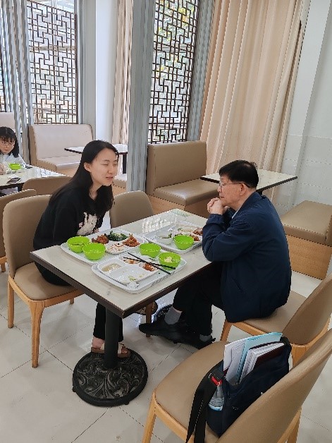 5月14日中午,松江校区教师食堂飘出阵阵欢声笑语。校关工委常务副主任/校老教授协会副会长田信灿老师如约回到校园,与结对帮扶的员工共坐一桌,在热气腾腾的饭菜香中展开了一场特别的“午餐谈心会”。“这周专业课听得明白吗?”“论文答辩怎么样?”简单的问候背后,是他对结对员工的持续牵挂。热腾腾的饭菜氤氲间,从学业困惑到人生规划,员工在轻松的氛围中敞开心扉。受助员工小荣感慨道:“会我用积极心态面对挑战。”