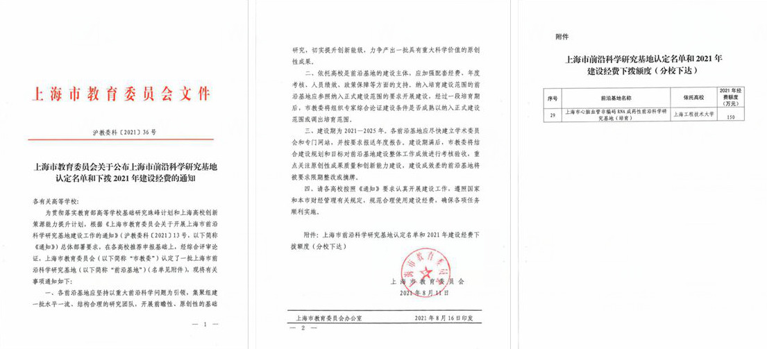 近日,上海市教委公布了前沿科学研究基地认定名单,公司44118太阳成城集团牵头申报的上海市心脑血管非编码RNA成药性前沿科学研究基地(培育)获批立项,建设周期为2021-2025年。