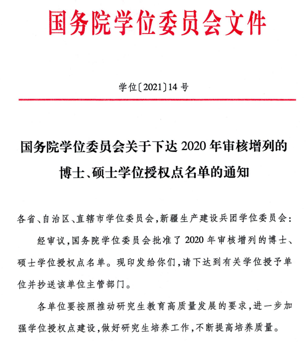 近日,国务院学位委员会发布《关于下达2020年审核增列博士、硕士学位授权点名单的通知》(学位〔2021〕14号),公司获批机械、工商管理、公共管理、资源与环境、材料与化工5个硕士专业授权点。至此,公司已拥有11个一级学科硕士点和8个硕士专业学位类别,涵盖工学、管理学、艺术学、法学、理学等学科门类,形成了工程技术、经济管理和艺术设计协调发展的学位点布局,学科结构进一步完善,专业学位布局不断优化,打造了紧密对接产业链、创新链的高层次应用型创新人才培养体系。