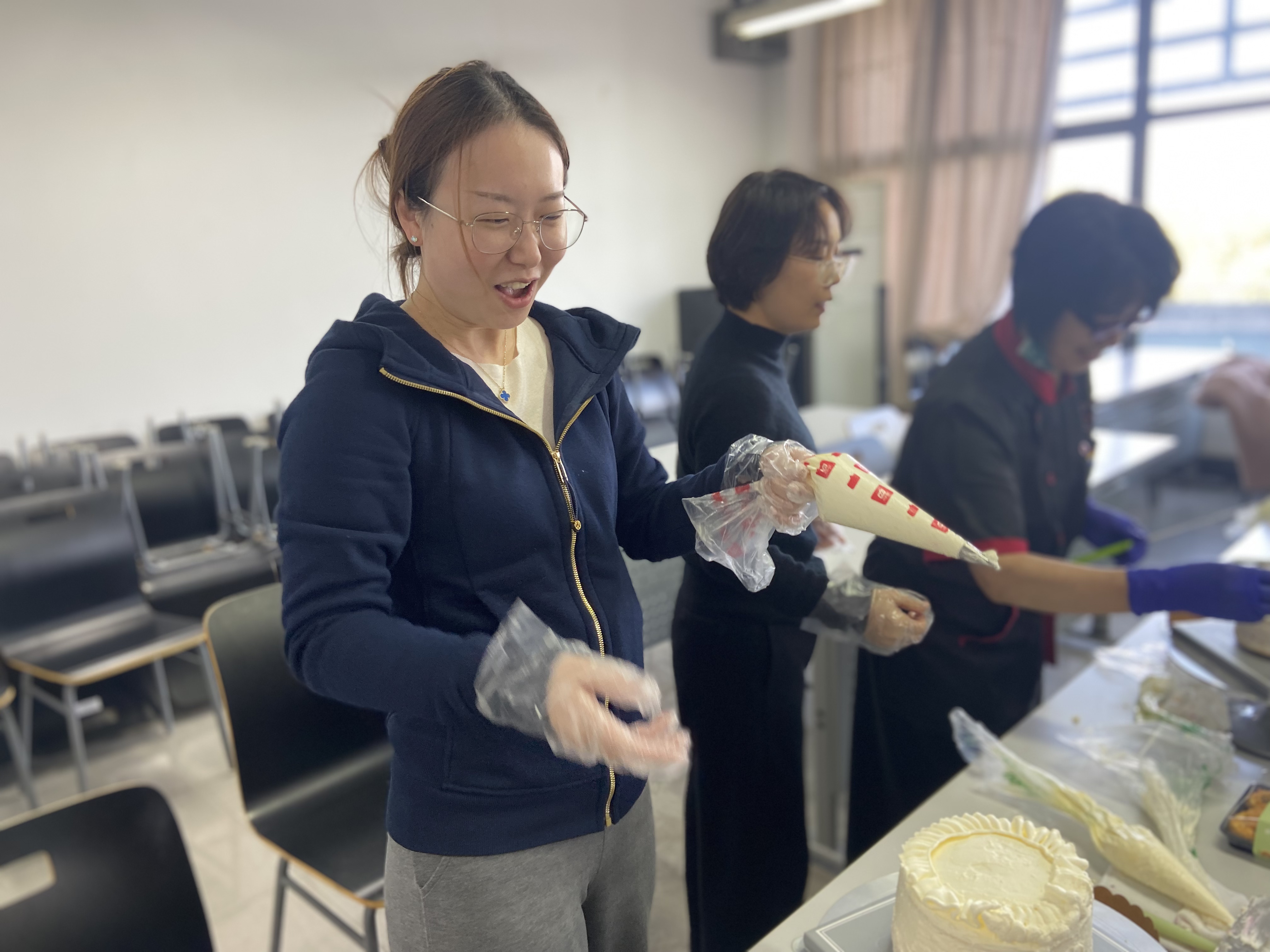 专业烘焙师现场指导,女教师们化身“甜点师”。从称量配料、打发奶油到裱花装饰,大家分组协作,时而交流烘焙心得,时而互相帮助解决操作难题。实验室的严谨与烘焙的创意碰撞出别样火花:有小组设计“拉布布蛋糕”造型,将流行特色融入甜品;更有小组创作“五彩缤纷”糖霜图案。实训中心4418变身“甜蜜工坊”,笑声与赞叹声此起彼伏。