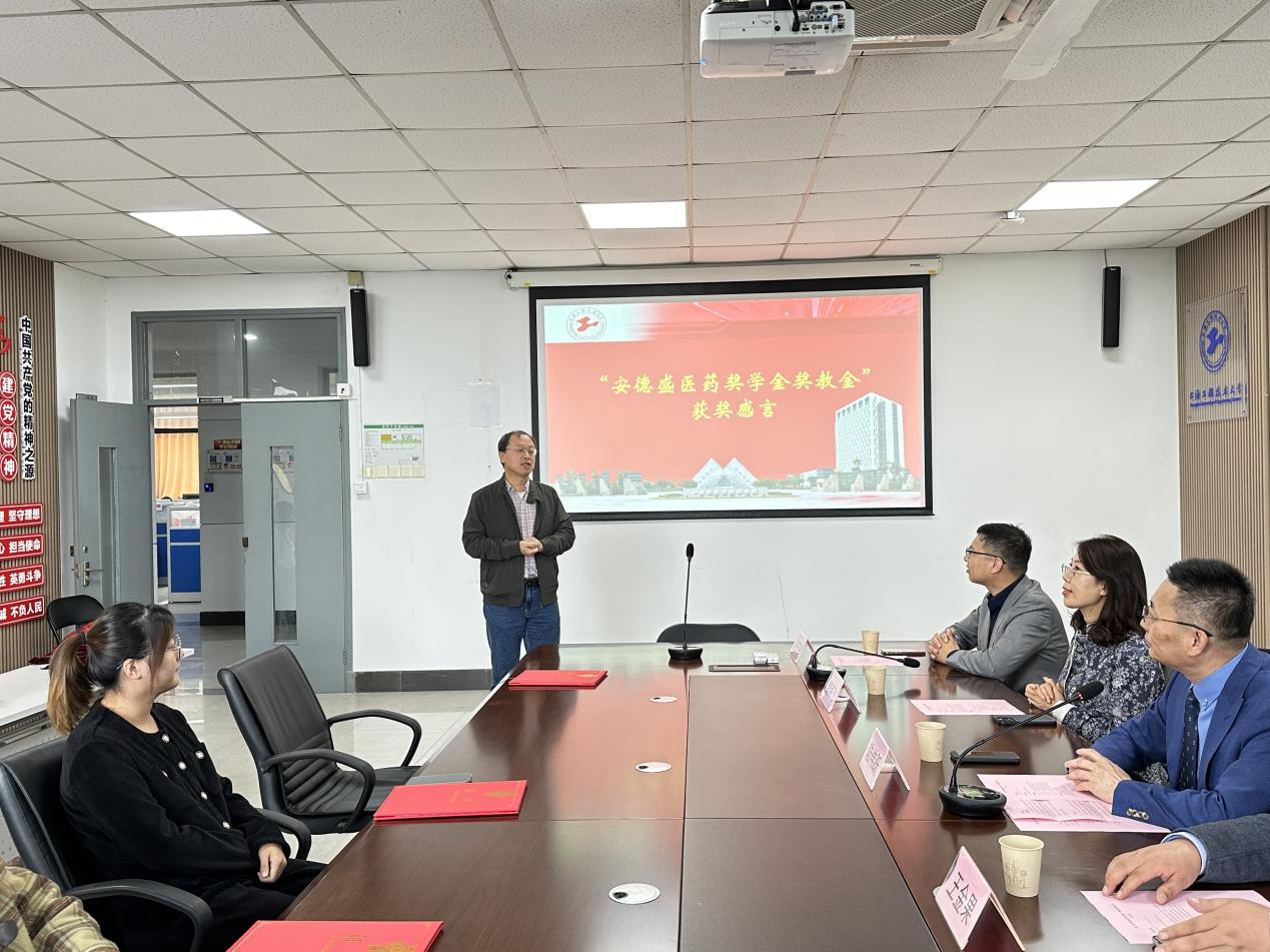 在颁奖环节中,医药前沿技术研究院经理陆伟跃教授宣读获奖研究生和教师名单。本次获得“优秀学习奖学金”的研究生是郭昌璞、龚静伊、黄雨萌,获得“优秀贡献奖学金”的研究生是彭仁苗和雷颖,获得“优秀教师奖教金”的教师为是尹学博和于桐。嘉宾们分别向他们颁发了第二届安德盛医药奖学金和奖教金证书。获奖研究生和教师们勇于挑战自我、奋进拼搏,在学习和工作上取得了傲人成绩,为研究院全体研究生和教职员工树立了榜样,本次获奖必将进一步激励他们再接再厉、再创佳绩。获奖教师代表尹学博教授表示,非常感谢安德盛医药对我们的支持,这不仅是一份荣誉,更是一份责任。我们将继续努力,争取在未来的科研工作中取得更大的成果,为国家的生物医药事业贡献力量。