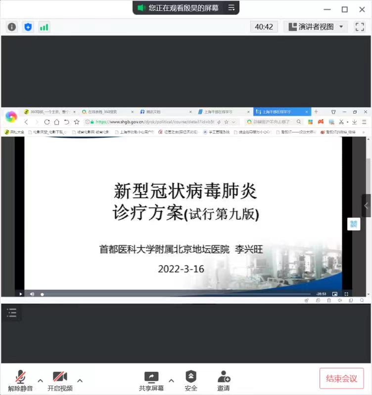 最后,支部所有党员一起在线观看了“上海干部在线学习 平台”上“疫情防控学习资料”专栏中的《新型冠状病毒肺炎诊疗方案(第九版)》、《区域新型冠状病毒核酸检测组织实施指南》两个视频,从中大家能够学习到当前我国针对新冠肺炎疫情这一疾病所采取的最新、最全、最细的政策,对切实打赢疫情防控攻坚战提供了强有力的理论指导。