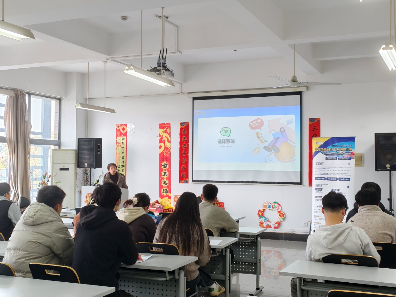 会上,企业代表全面介绍了慧瑞环保在高性能水性涂料研发方面的创新成果及“双碳”背景下的发展战略,重点解读了研发工程师、技术支持及生产管理等多个核心岗位的招聘计划与薪酬福利。互动环节中,同学们就行业前景、职业晋升路径等问题踊跃提问,现场气氛活跃。