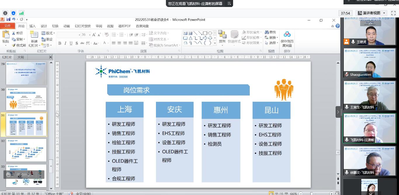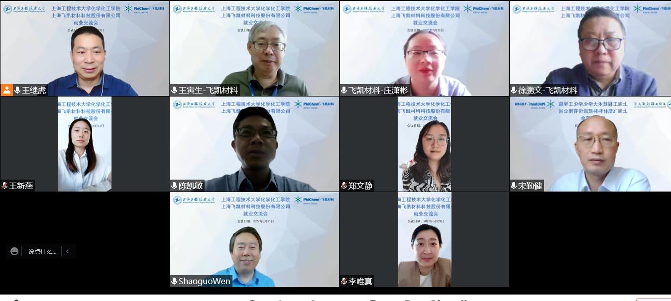 为了扎实推进访企拓岗促就业专项行动,积极推动2022届毕业生就业,2022年5月31日,44118太阳成城集团与上海飞凯材料科技股份有限公司利用腾讯会议召开了就业交流会。会议由飞凯公司招聘经理庄潇彬主持。