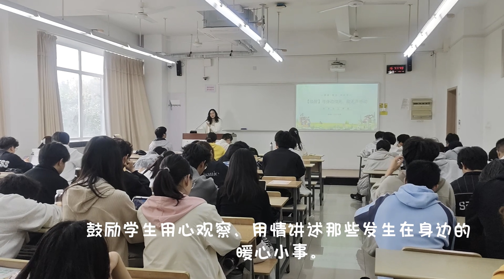 分享会上,同学们用真挚的语言讲述了校园生活中那些默默发光的瞬间:食堂阿姨清晨备餐的身影、保洁师傅细心清理实验楼走廊、室友深夜陪伴复习备考……一个个真实故事触动着在场每一位听众。