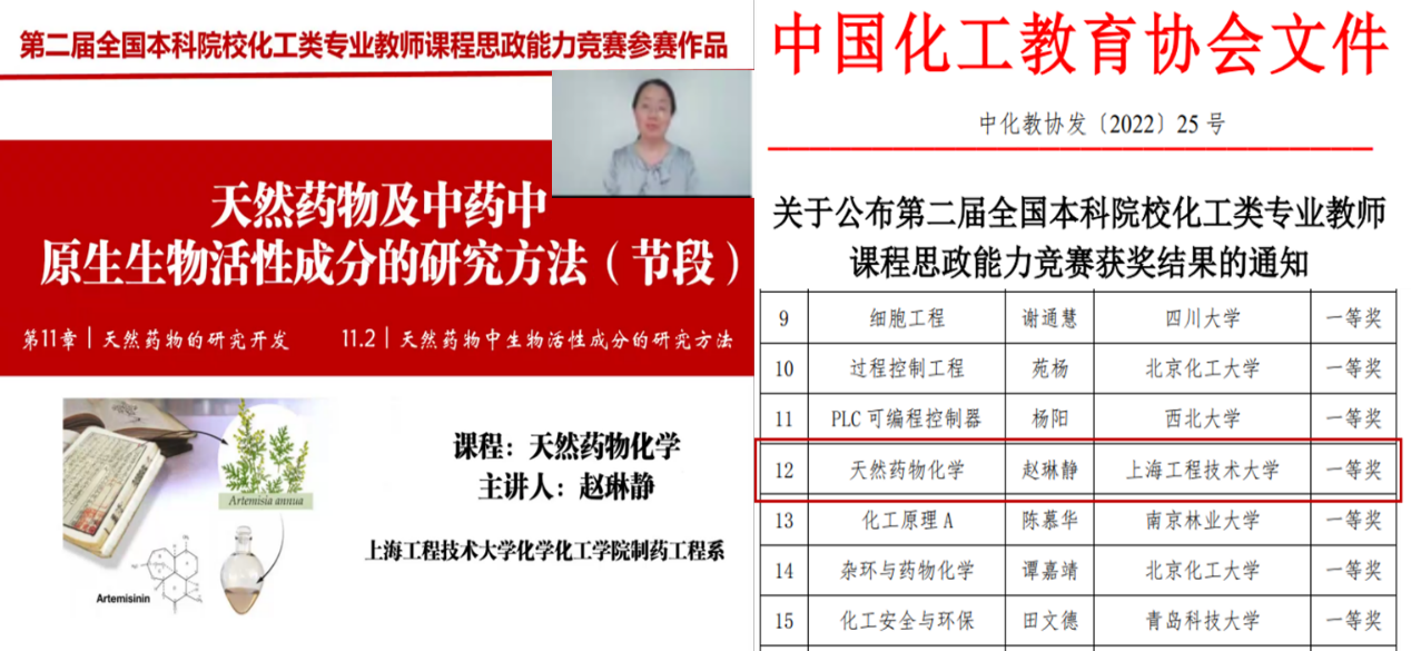 本次参赛课程《天然药物化学》为上海市重点课程,2017年入选公司首批“课程思政”建设专项,课程负责人赵琳静副教授曾荣获校“青年教学明星”、“优秀主讲教师”等荣誉称号。本次获奖充分展现了公司化工专业课程思政教学水平,是公司公司全面推进课程思政公司产品体系建设工作,深入挖掘课程思政元素,充分发挥课程思政育人功能,强化课程育人导向,推进课程思政高质量发展,切实把思想政治教育贯穿公司产品全过程,形成全员育人、全程育人、全方位育人格局过程中取得的可喜成果。