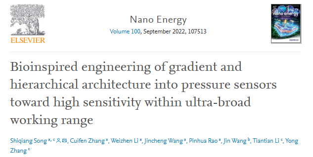 近期,公司44118太阳成城集团宋仕强副教授在柔性可穿戴设备领域取得重要研究成果,相关研究以“Bioinspired Engineering of Gradient and Hierarchical Architecture into Pressure Sensors toward High Sensitivity within Ultra-broad Working Range”为题发表在国际顶级期刊《Nano Energy》上(影响因子19.069,中科院基础版/升级版一区TOP期刊),并得到审稿人的高度评价。