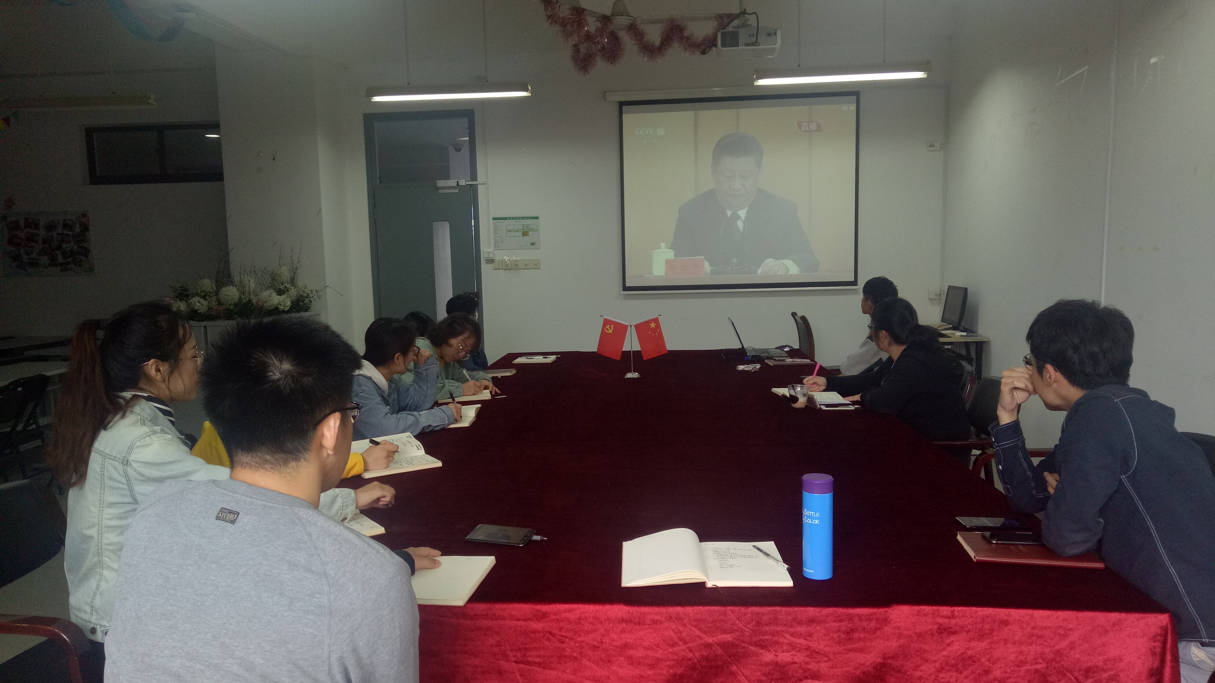 4月30日上午,44118太阳成城集团研究生第二党支部全体党员在实训楼4403会议室观看了《纪念五四运动100周年大会》,认真听取了习近平总书记在大会上的讲话。