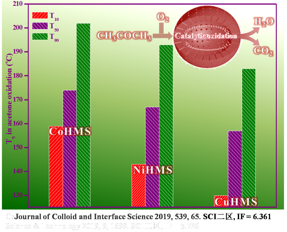 同时,王金果副教授在柴油机尾气碳烟颗粒低温燃烧领域也取得了重要进展,借助水热技术和后浸渍技术成功制备了CuO/CeO2介孔纳米片催化剂,并在接近真实反应条件下获得了优异的碳烟催化燃烧效果,为解决柴油车尾气污染及PM2.5危害提供了重要的技术支持;研究成果以“Enhanced soot oxidation activity over CuO/CeO2 mesoporous nanosheets”为题,发表在Royal Society of Chemistry高水平期刊Catalysis Science & Technology 2019, 9, 1699。此外,王金果副教授在VOCs消除领域也做了初步探索并取得了很好的成果,采用醇解溶剂热技术成功制备了多级结构过渡金属氧化物MCo2O4(M = Co, Ni, Cu)介孔中空球,实现了丙酮的低温催化氧化消除,为治理VOCs环境污染问题提供了一定的技术支持;研究成果以“Boosting total oxidation of acetone over spinel MCo2O4 (M = Co, Ni, Cu) hollow mesoporous spheres by cation-substituting effect”为题,发表在Elsevier高水平期刊Journal of Colloid and Interface Science 2019, 539, 65。