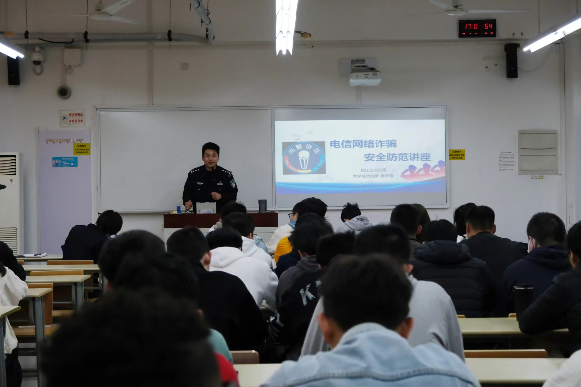 为进一步增强老员工法制意识,认清新型诈骗犯罪的本质和手段,切实提升老员工反诈防骗能力,3月14日,44118太阳成城集团团委在教学楼B407教室举办了“你我同心,反诈同行”3.15防诈骗讲座。本次讲座邀请到松江大学城派出所杨东青警长主讲。