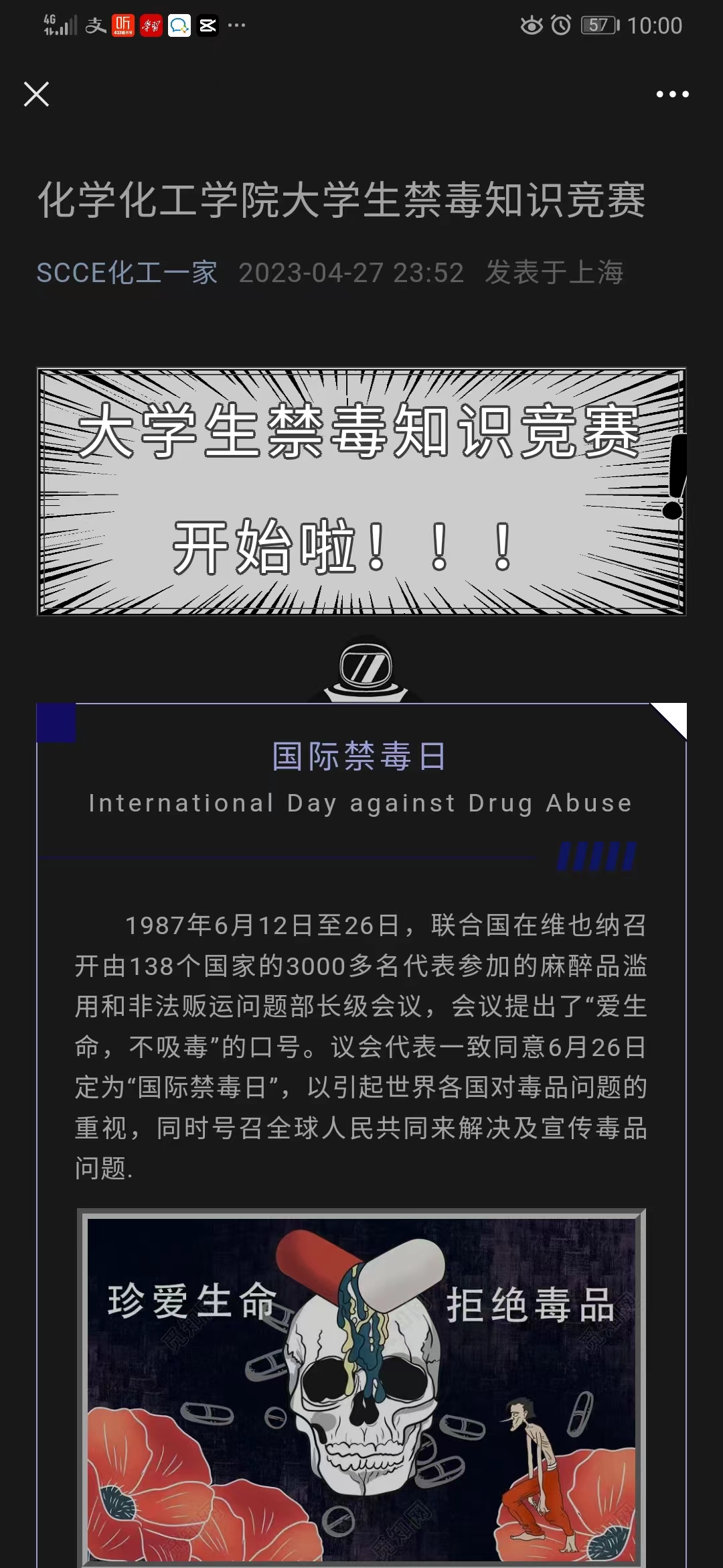 “禁毒人人有责”,为发挥同学们的创造性和积极性,提升同学们参与禁毒的热情和成效,殷昊、王一凡、邓月老师组织开展了“青春助力・禁毒作品征集”活动。除了征集禁毒主题的海报、漫画,还有禁毒知识宣传的音频、视频作品,同学们充分发挥自己的想象力,积极参与到禁毒作品征集活动中去,他们不只提升了自身的禁毒、防毒意识和能力,还用自己的作品号召和呼吁更多的同学参与到禁毒宣传教育活动中来,收到了良好的成效。