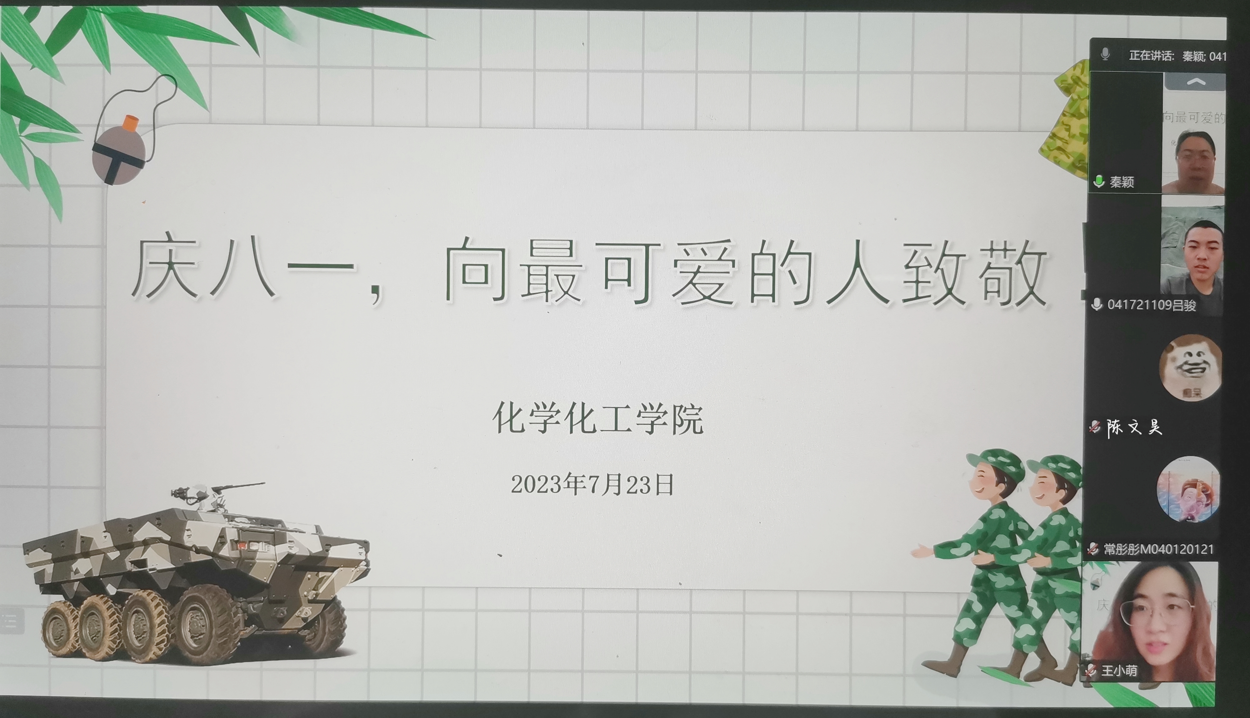 会上,三位参军同学介绍了自己在部队的训练情况和成长经历,他们表示经过部队的训练,能够很快适应部队的生活,有信心在部队建功立业;同时,他们对公司和公司的培养和关怀表示感谢。秦颖老师认真倾听了同学们的发言,充分肯定了他们在部队所做出的贡献,她嘱托同学们在部队一定要听党指挥,忠于职守,严守纪律;同时,要加强学习,提高政治素养,提升专业技能;最后,她希望同学们常与公司联系并向他们表达了最诚挚的问候和节日的祝福。
