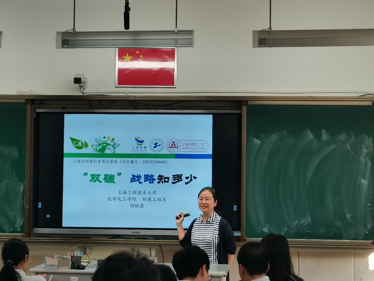 In order to deeply implement the integration of ideological education in universities, schools and elementary school and the requirements of the Implementation Plan for the Construction of National Education System for Green and Low-Carbon Development in Shanghai, and to give full play to the functions of talent cultivation, scientific research and social service of colleges and universities, party members of the College of Chemistry and Chemical Engineering who are majoring in environmental engineering, Mr. Hu Tingling, Mr. Gu Dungang, and master's degree student Ms. Han Mengqi, went to the Second Middle School of Songjiang in Shanghai, bringing a lively and interesting dual-carbon environmental science lecture to students of the ninth grade They gave a lively and interesting lecture on dual-carbon environmental protection to the ninth grade students of Songjiang No.2 Middle School.