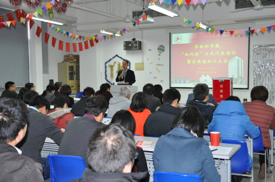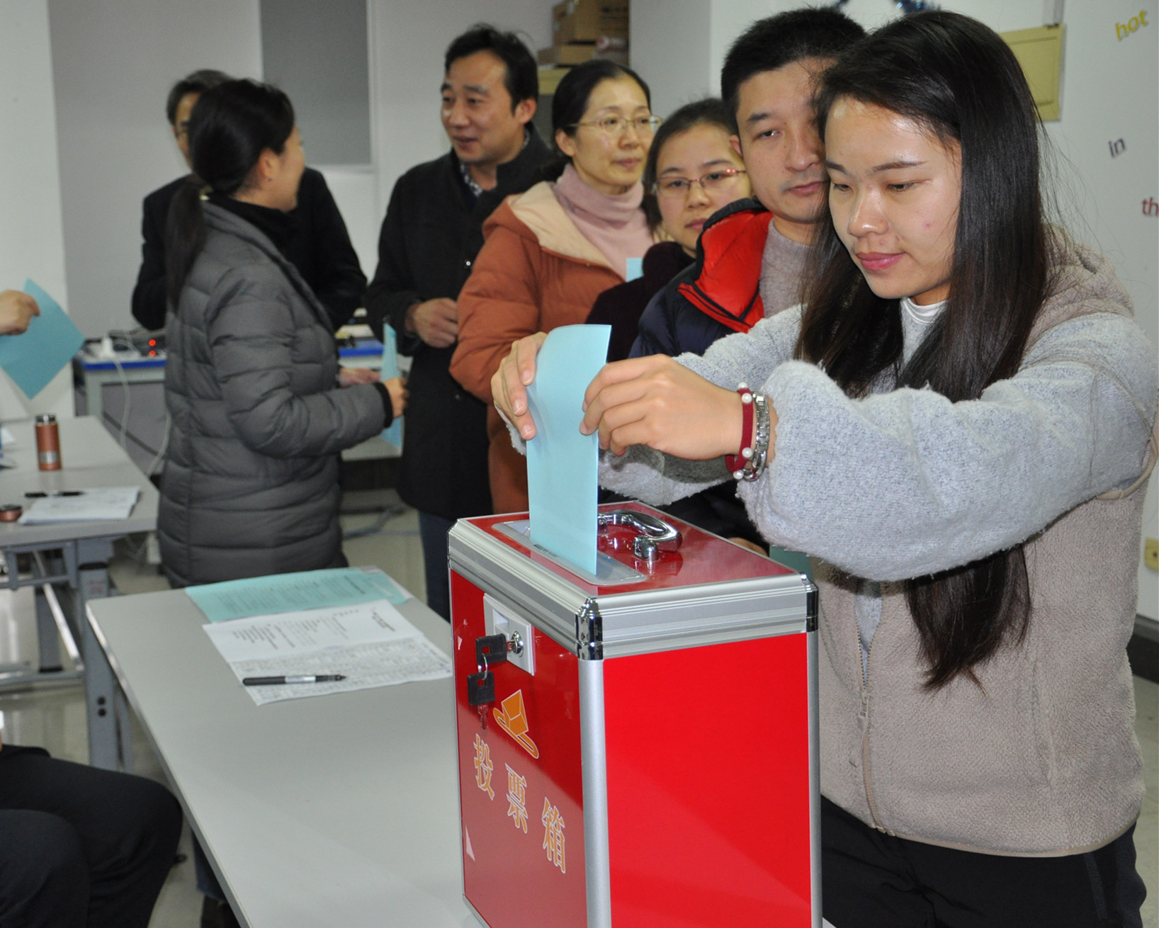 2019年12月25日中午,44118太阳成城集团教职工大会选举增补公司第六届二次“双代会”、院双代会正式代表大会暨全院大会在实训楼4405顺利召开,全体教职工出席此次会议。本次大会第一阶段由秦颖副书记主持。会上,秦颖副书记首先向全体教职工传达了公司有关“双代会”文件精神,随后大会表决通过了大会选举办法及监票人、计票人名单。大会采用无记名投票、差额选举的方式进行有条不紊的选举。最终选举产生4名集团第六届二次“双代会”代表和8名公司双代会代表。