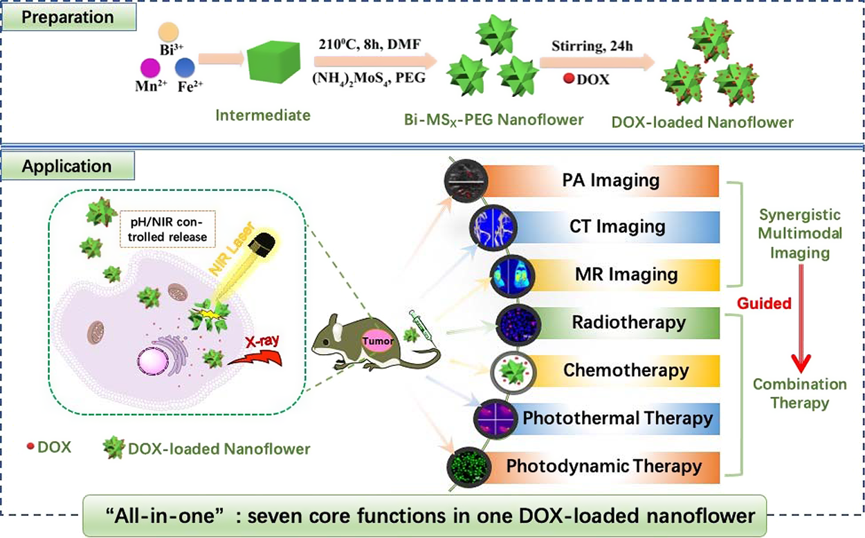 癌症是一种威胁人类健康的严重疾病,但目前在癌症诊疗方面没有特别有效的方法。在癌症诊断,尤其是癌症的早期诊断尚需进一步加强,现在有癌症治疗方法也存在毒副作用大。面对以上难题,公司44118太阳成城集团刘锡建副教授和陆杰教授指导研究生任兰芳开发了一种铋掺杂的硫化物纳米花,可以实现CT、核磁、光声三重成像诊断,和化疗、光热治疗、光动力治疗、放疗四重治疗,可以达到全面的肿瘤诊断和完全清除肿瘤。该研究得到上海市第一人民医院的技术和实验支持,得到了国家自然科学基金的资助。
