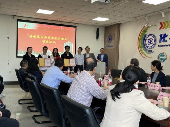 谢开平总监代表上海安德盛生命科技有限公司向公司捐赠为期三年的安德盛医药奖学金和奖教金,袁春平副经理代表医药前沿技术研究院接受捐赠并回赠感谢状,感谢上海安德盛生命科技有限公司对公司医药技术及其产品研发工作的支持。