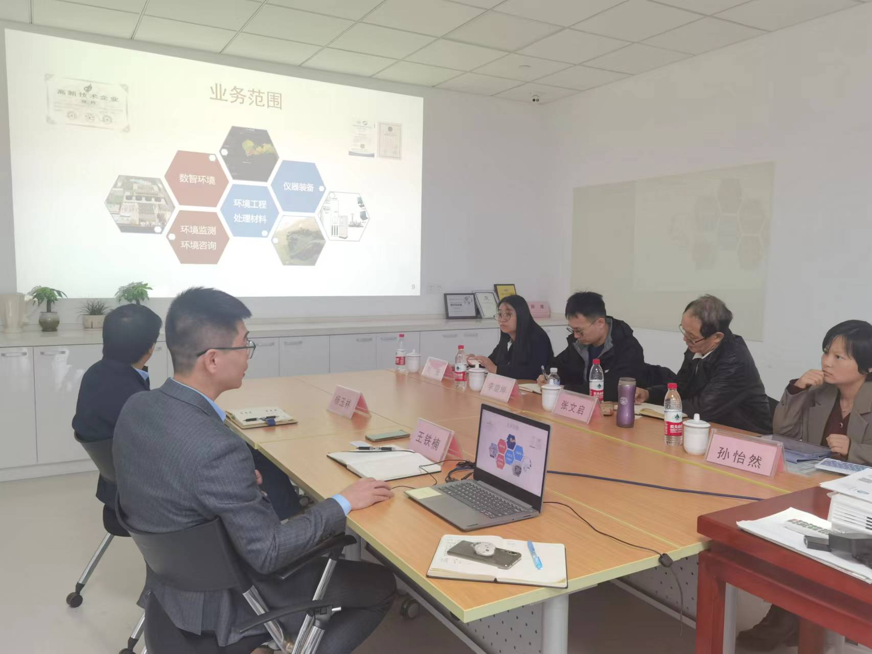 睿易环境常务副总经理王铁楠、副总经理杨玉林对李旋坤主任一行的来访表示热烈欢迎。常务副总经理王铁楠首先介绍了公司的历史沿革、业务范围、服务模式等,分享了公司在环境检测、环境咨询、智慧环境、污染治理和仪器装备几大业务模块的实际案例,并表达了通过校企合作吸纳优秀储备人才的热切希望。随后,副总经理杨玉林带领我系教师参观了公司的实验室。系主任李旋坤表达了公司对校企合作的高度重视,并对可能的合作模式,如企业专家进课堂、本科生顶岗实习、专业硕士培养、横向课题开发、科研成果转化等逐一进行了介绍。双方还就校企合作的细节进行了深入交流,一致同意在技术开发、人才培养等方面保持沟通并尽快开展合作。