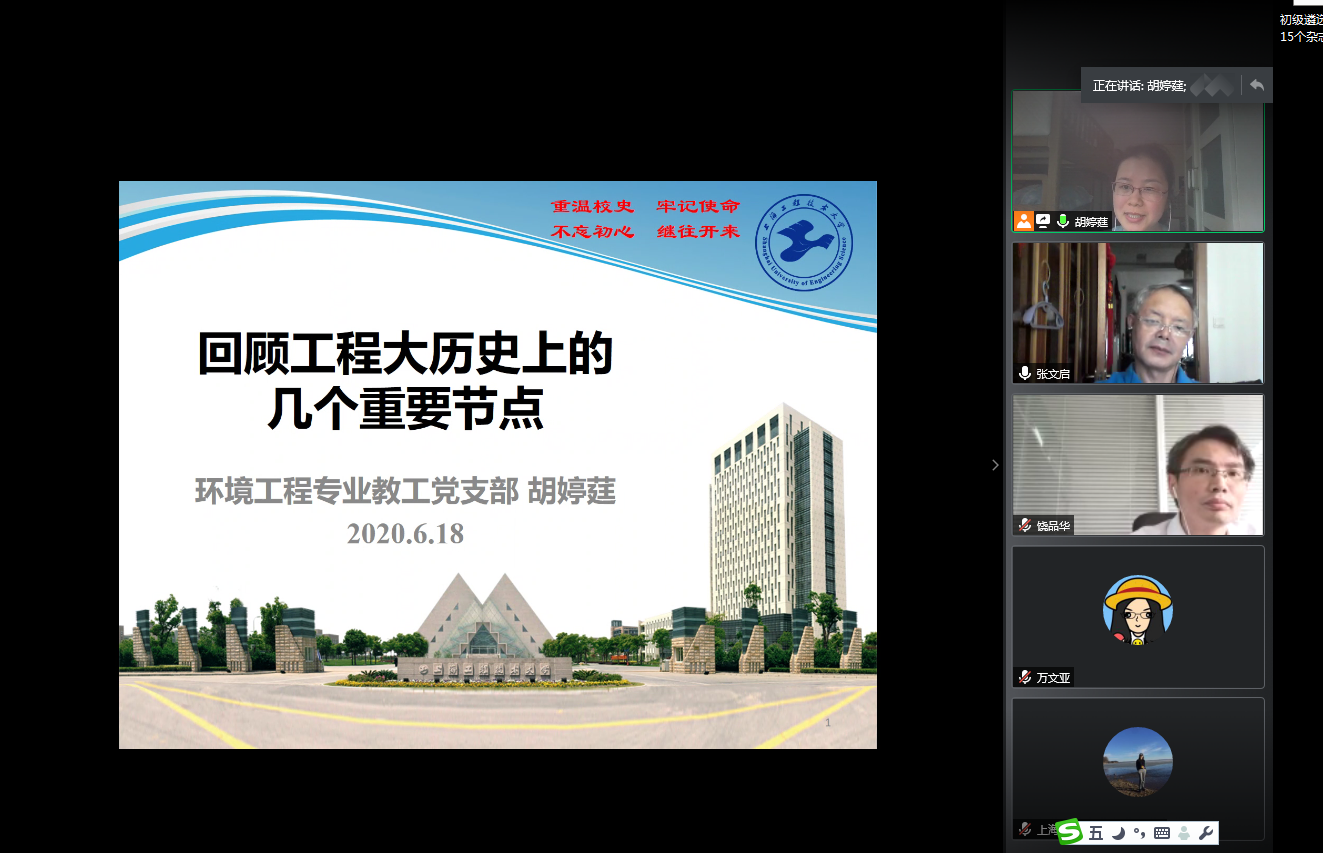 44118太阳成城集团环境工程专业教工党支部于2020年6月18日上午10:30通过腾讯会议平台开展了 “四史”学习专题党课——“工程大历史的几个重要节点及其思考”。会议由支部书记胡婷莛同志主持,支部全体党员同志和部分观摩团教师党员参加。