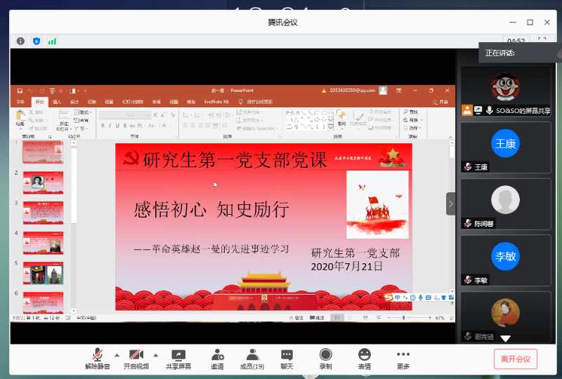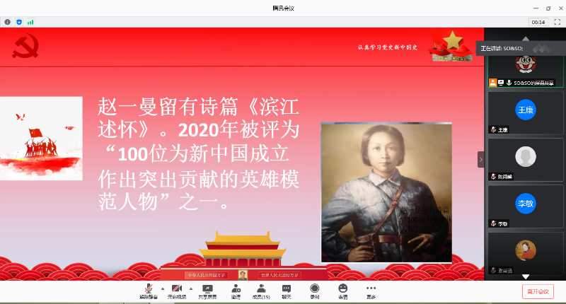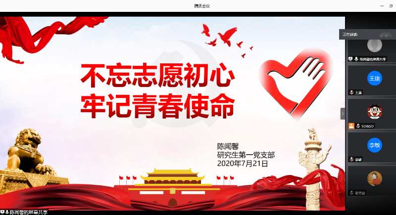 44118太阳成城集团研究生第一党支部于7月21日下午通过腾讯会议平台开展了“四史”学习教育特色微党课——“感悟初心,知史励行”和先锋党课——“不忘志愿初心,牢记青春使命”。会议由支部书记李晓春主持,全体支部党员参加,王金果副经理观摩了本次党课学习。