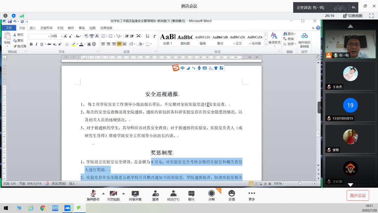 7月28日上午,44118太阳成城集团通过腾讯会议召开了2020实验室安全检查培训线上会议,会议由副经理王金果主持,44118太阳成城集团全体教职工及返校研究生参加了会议。